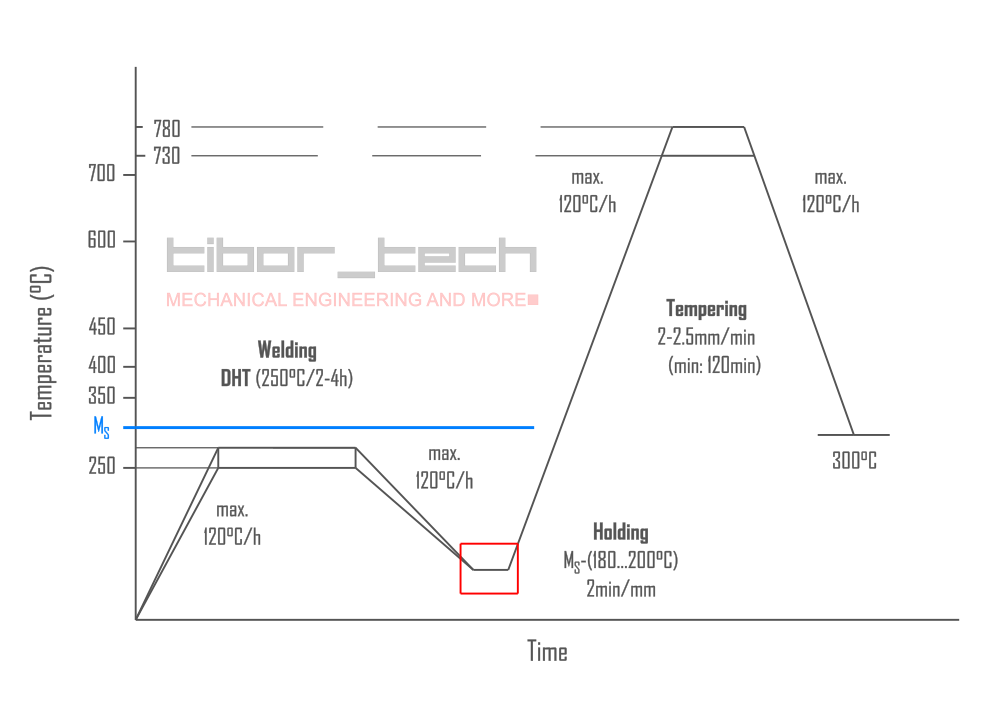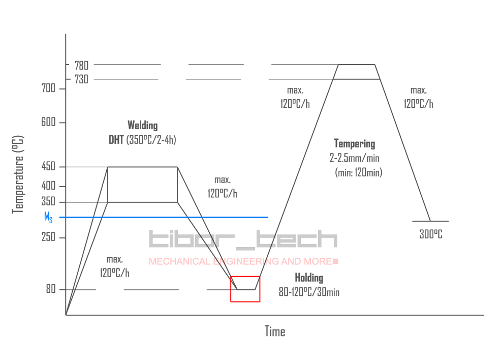 To reach the tempering temperature, the welded joint must be heated at 100-200°C/h. If the joint is cooled immediately after welding and then tempered, carbide and ferrite precipitation can occur during the cooling of the remaining austenite.