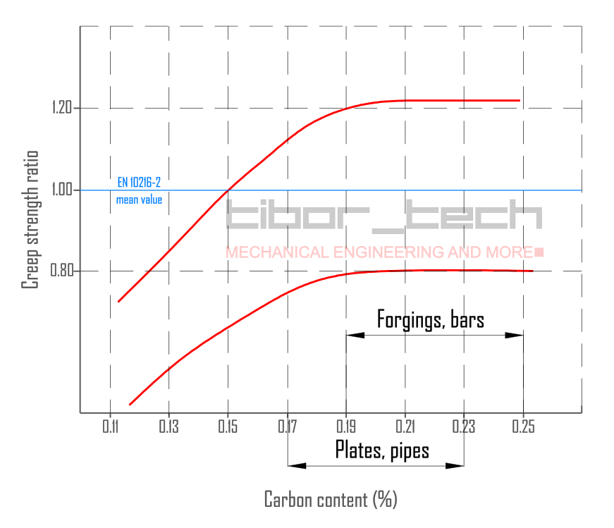 The high creep strength of this steel is primarily attributed to its fine microstructure with a high density of dislocations. At elevated temperatures, the dislocation density decreases due to relaxation, but precipitates on the grain boundaries prevent the microstructure from coarsening. This mechanism contributes to the steel’s structural stability and strength. X20CrMoV12-1 steel requires a minimum carbon content of 0.17% to achieve the necessary creep strength per EN 10216-2 – Figure 3. Structural stabilization through carbides is an optimal strength mechanism requiring minimum carbon content. This also explains why the material X11CrMo9-1+NT has significantly lower creep strength.